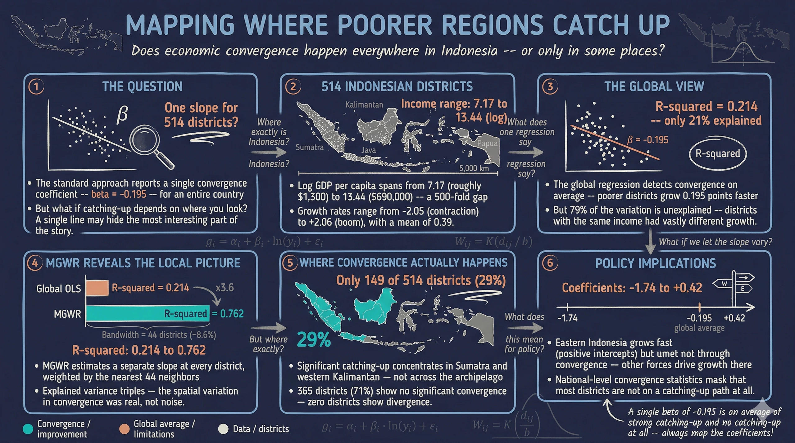 When we ask “do poorer regions catch up to richer ones?”, the standard approach is to run a single regression across all regions and report one coefficient. But what if the answer depends on where you look? A negative coefficient in Sumatra does not mean the same process is at work in Papua. A global regression forces every district onto the same line — and in doing so, it may hide the most interesting part of the story.