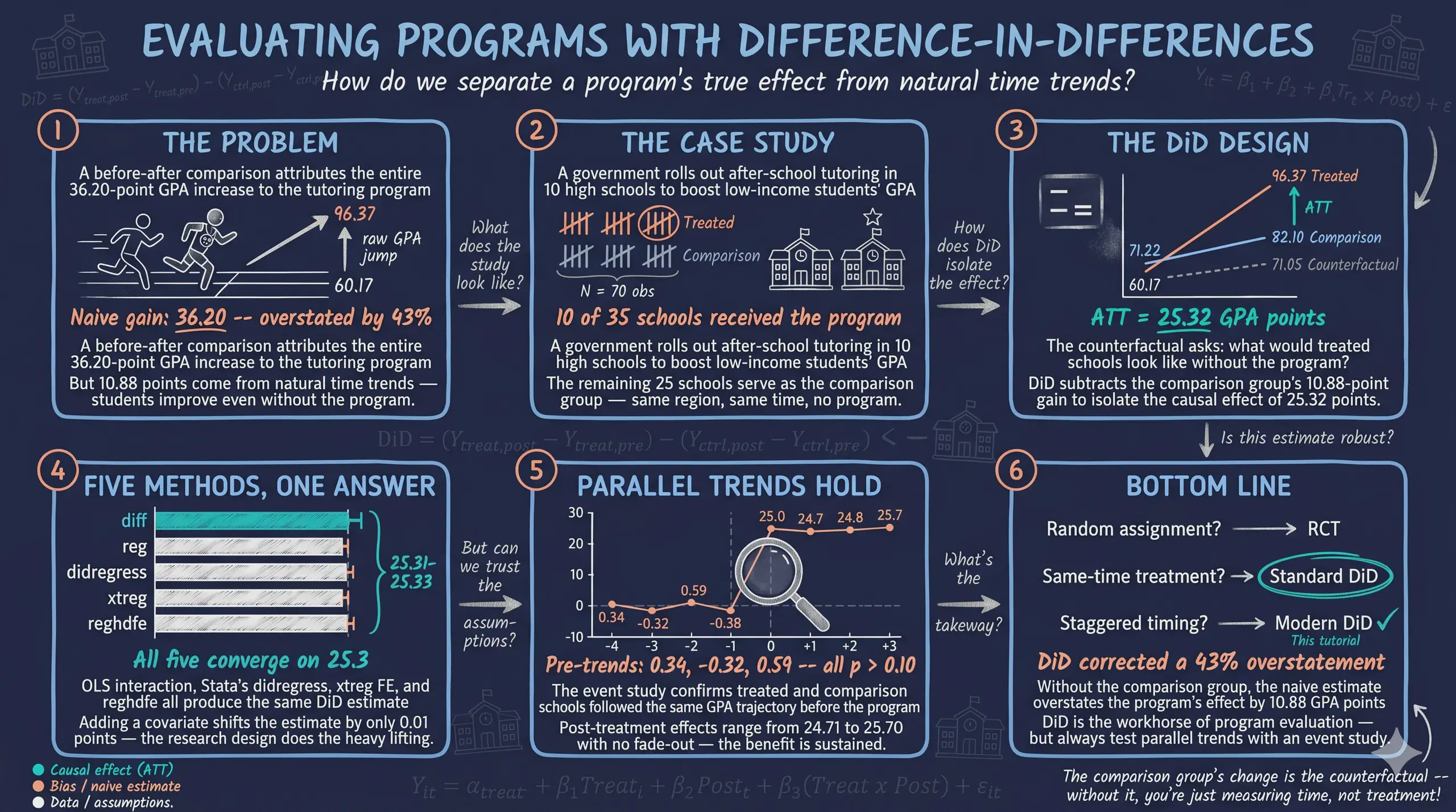 We progress from a naive before-after comparison (which overstates the effect) to the full DiD regression framework, demonstrate five equivalent estimation approaches in Stata, and extend the analysis with an event study design that tests whether the parallel trends assumption holds. By the end, we find that the tutoring program increased GPA by approximately 25.32 points on a 0-100 scale — a large and statistically significant effect.