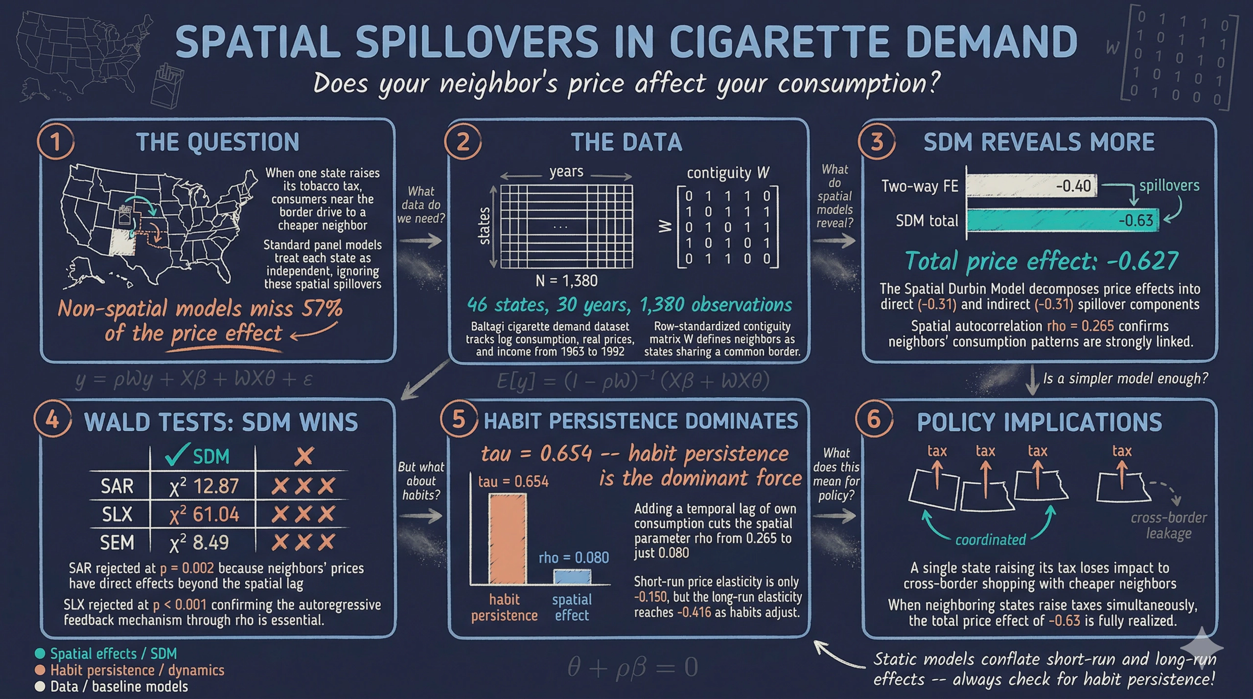 This tutorial demonstrates that spatial dependence matters for modeling cigarette demand across US states. The Wald tests in Section 7 conclusively reject all three restricted spatial models (SAR, SLX, SEM), confirming that the Spatial Durbin Model is the appropriate specification. The total price effect in the static SDM (-0.627) is more than 50% larger than the two-way FE estimate (-0.402), revealing that non-spatial models systematically understate the true price sensitivity of cigarette demand by ignoring cross-border spillovers.